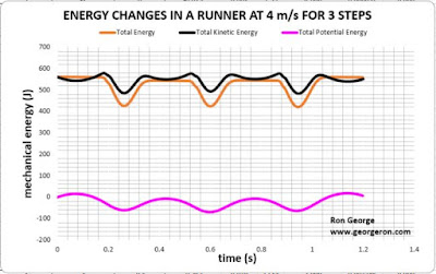 For level running, we understand from scientific literature that the storage and recoil of energy in the lower limbs restores an appreciable amount of energy into the positive work phase. Thus, the mechanical efficiency of running maybe greater than 30% depending on the skill and mechanics of the runner. This efficiency of running has a documented linear relationship to running speed.