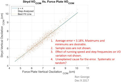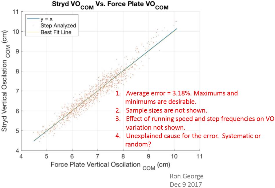 | Figure 5: Estmated vs actual vertical oscillation across a wide range of runners. Sample size is not disclosed. Experimental method and running speeds to generate the plot is unknown. Stated average error with respect to force plate = 3.18%. Base image courtesy of Stryd. Markups by me. |