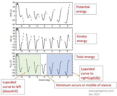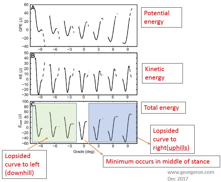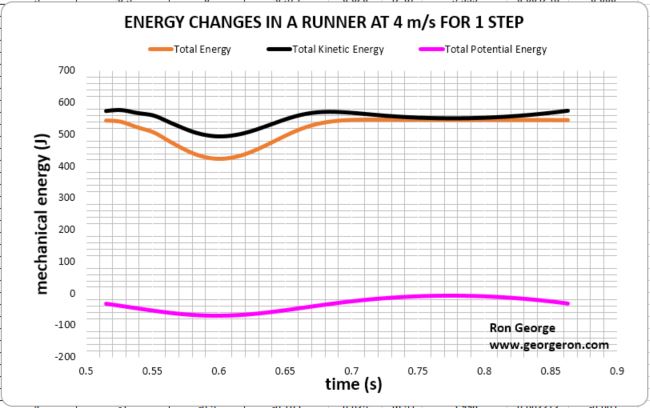 STEP 6 : The total energy of the center of mass as a function of time is a summation of the potential and kinetic energies. This will fluctuation function in time, with a minimum occuring at the middle of stance phase. For level running, the curve is symmetric. For gradient running, the curve is lopsided to the right side for uphills and to the left side for downhills.