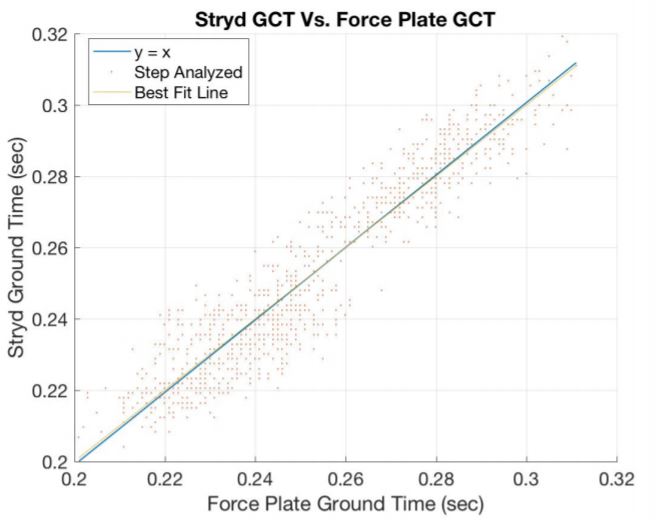 | Figure 4 : Plot showing goodness-of-fit of modeled GCT to force plate measurements. The average error is stated to be 2.83%. The number of runners, running speeds, shoes worn, footstrike mechanics and slope on the treadmill are all unknown which raises the question of how the error varies as a function of each. Image courtesy of Stryd. |