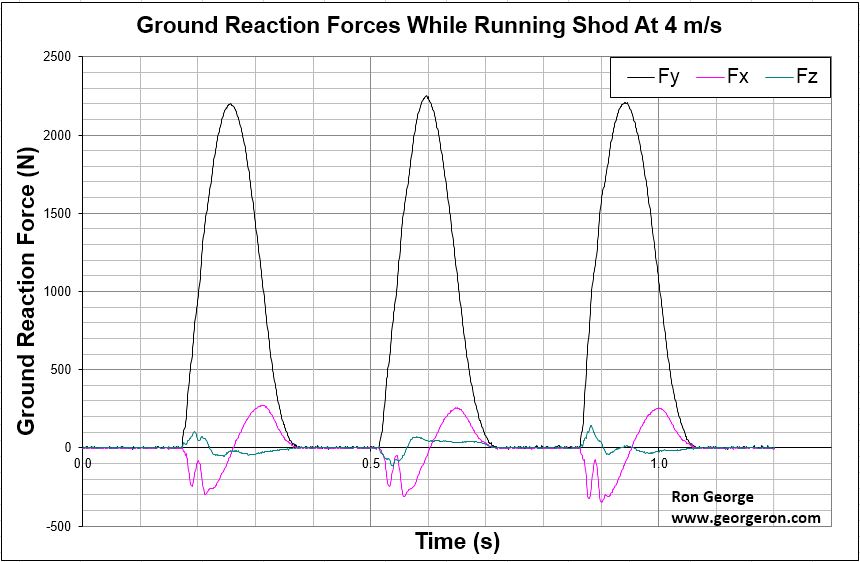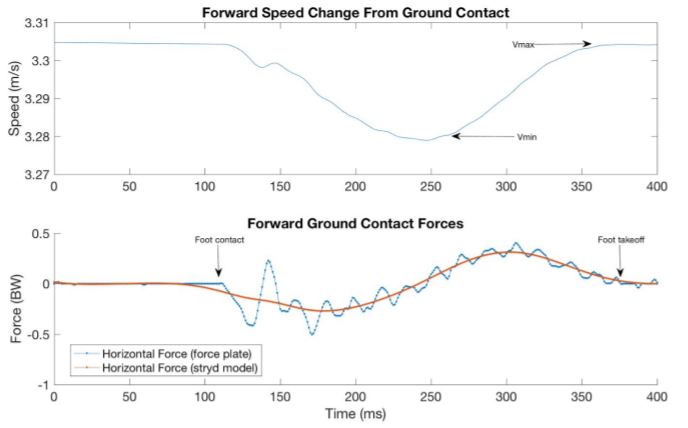 It is not known what speed the runner was running at but looking at the force signature, it is clear that it was a rear foot runner. The model estimation and force plate data nearly match, particularly when you look at the highest peak vertical force which is important in derivative calculations of impulse and leg spring stiffness.