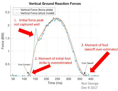 1) Misrepresentation of first footstrike peak : The Stryd models a nice rounded single peak force when there were actually two. This is significant because the footpod thinks that the footstrike is fore-footed when in reality it's rear-footed. The implications are :